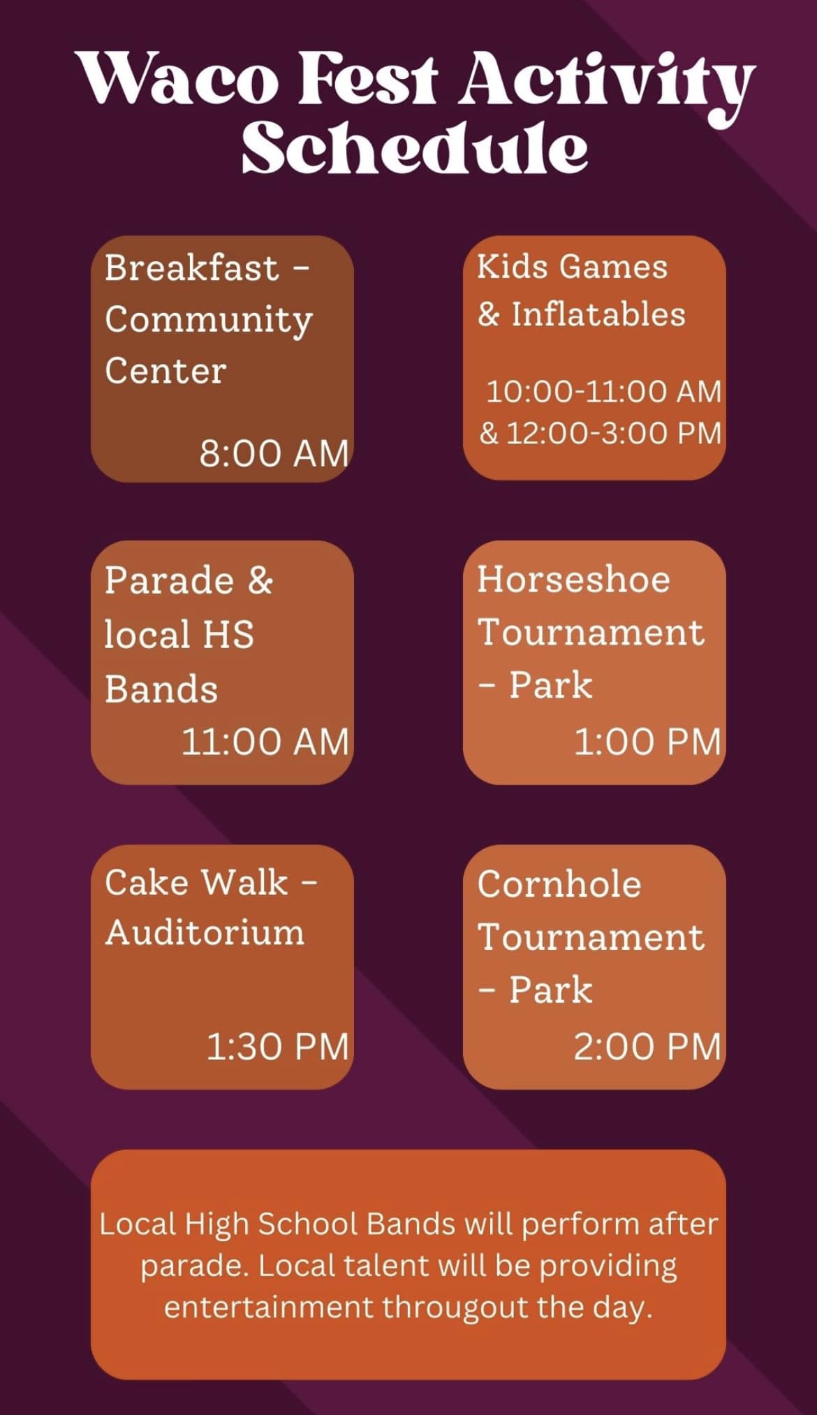 Come and join us for a day of good food, local talent, and fun for all ages! Vendors will be set up on Waco City Hall's lawn and parking lot. We will have cornhole & horseshoe tournaments at the park, as well as free kids’ games!