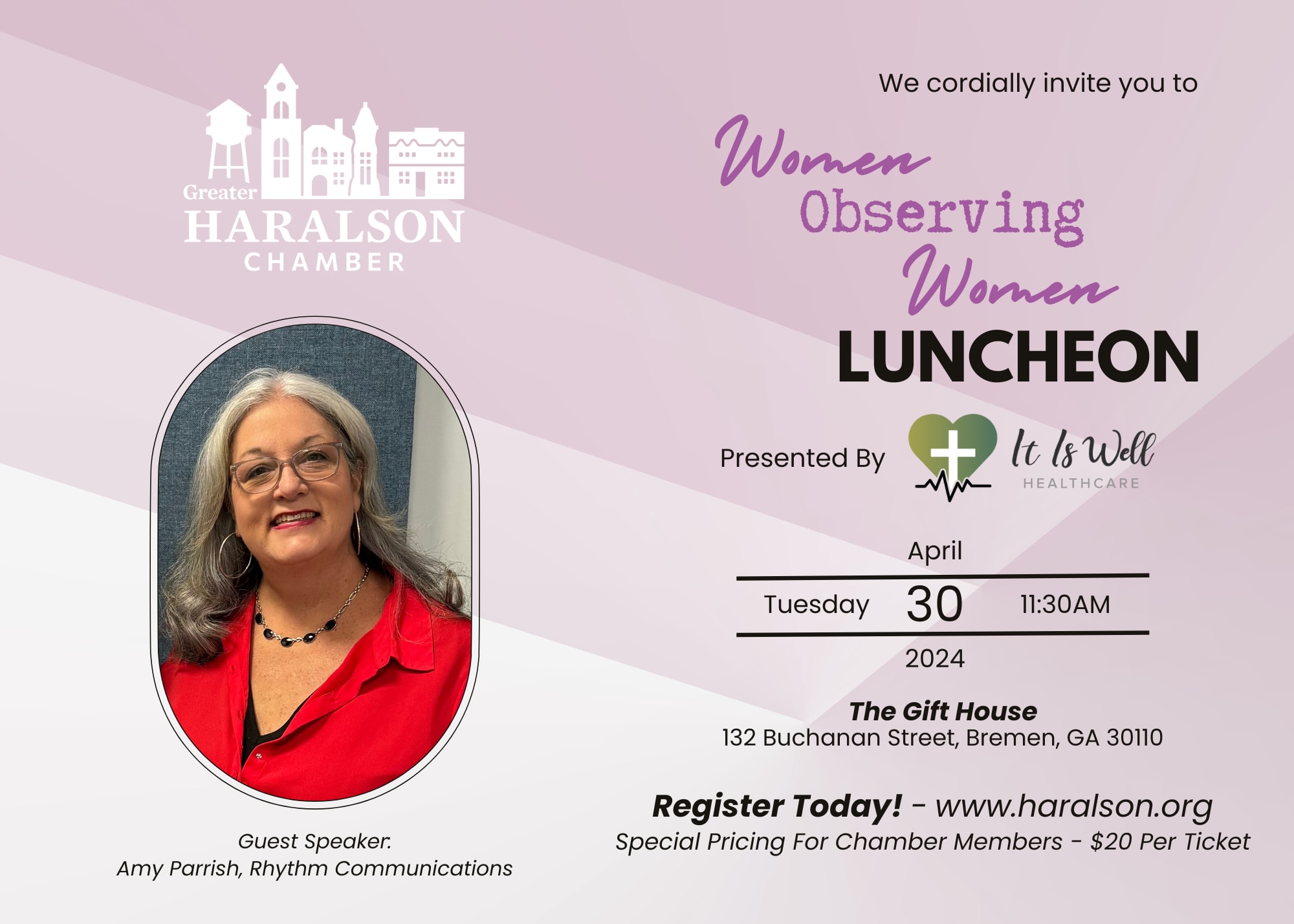 HARALSON COUNTY, Ga. [March 13, 2024] – The Greater Haralson Chamber of Commerce is happy to announce that the inaugural Women Observing Women (WOW) Luncheon will take place on Tuesday, April 30 from 11:30 a.m. to 1 p.m. at The Gift House, a female-owned business in downtown Bremen.